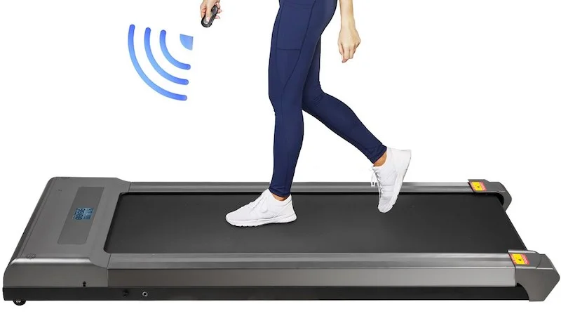 The VEVOR treadmill arrives at your home fully assembled. You simply place it directly under your desk, connect the device to the power supply and press the start button. Rollers are attached to the front, with which you can easily move the treadmill on your own. So if you don’t want to walk anymore and switch to your desk chair, you can easily push the device to the side.